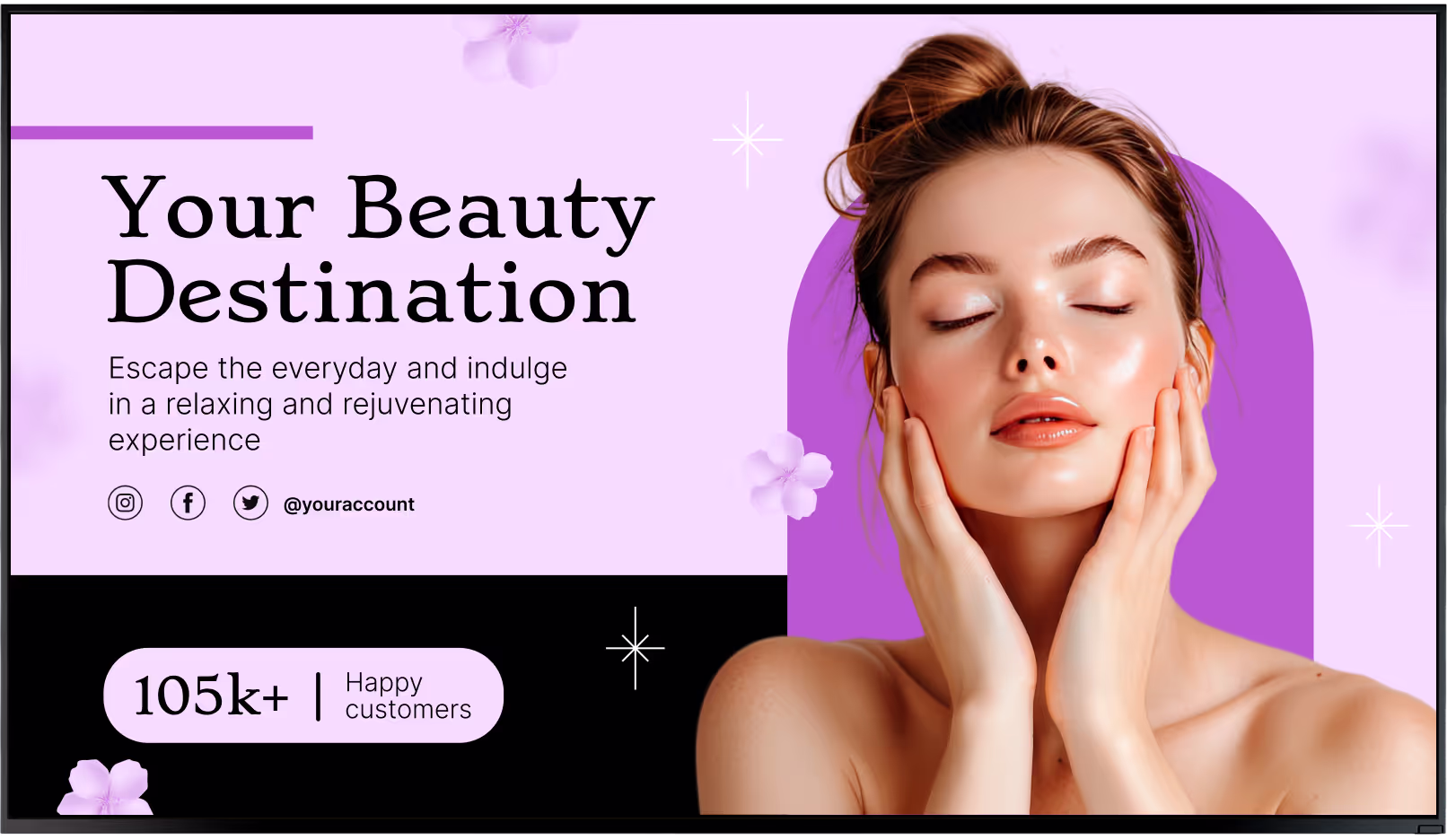 Explore our collection of spa-focused digital signage customizable templates. Easily adjust them to reflect your brand, showcase wellness content, and elevate your client’s experience.